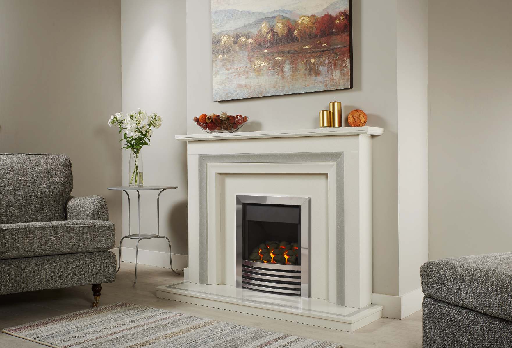 A fireplace with an Italian influence. The horizontal hearth also has a grey marble inlay to compliment the vertical profile.